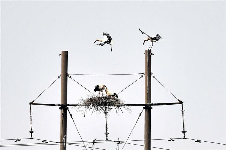 这是山东黄河三角洲国家级自然保护区电线杆上的东方白鹳的巢(2021年5月13日摄)。新华社记者郭绪雷摄