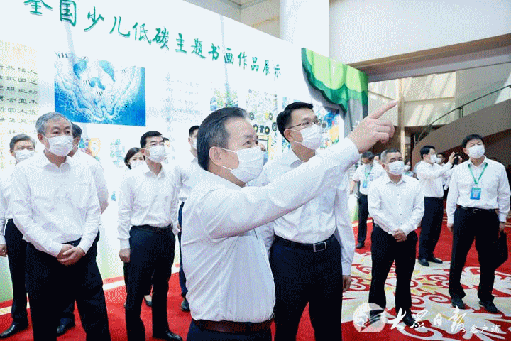 活动前,与会领导共同参观了2021年全国少儿低碳书画大赛获奖作品展、全国低碳主题展、山东低碳主题展。