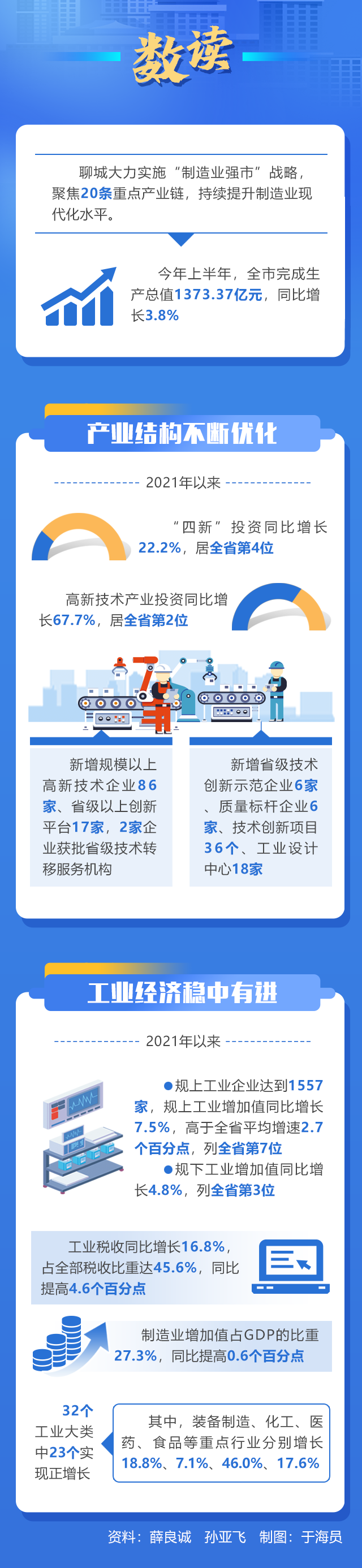 担任各链长的市级领导“挂帅又出征”,带头开展“巡链”活动,打通产业链发展的“堵点”“难点”“断点”;懂企业、通产业、熟悉经济工作的优秀干部担任助企专员,为企业提供全方位的精准服务……党员干部的干劲铆足了,拼劲增强了,企业家们看到了投资聊城的大好前景。上半年,聊城规上工业企业达到1557家,规上工业增加值同比增长7.5%。制造业技改投资增长44.8%,“四新”投资增长22.2%,高技术投资增长67.7%,均居全省前列。