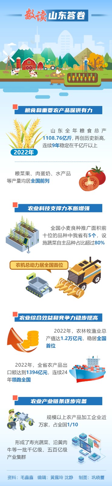 悠悠万事,吃饭为大。山东牢记习近平总书记“农业大省的责任首先是维护国家粮食安全”的嘱托,坚定扛牢大省责任,毫不放松抓好粮食生产。在刚刚过去的2022年,全省粮食总产1108.76亿斤,比上年增加8.62亿斤,再创历史新高,连续9年稳定在千亿斤以上,连续两年稳定在1100亿斤以上。