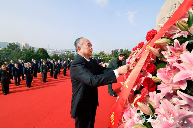 林武、石正露、周乃翔登上纪念塔基座,仔细整理花篮缎带。花篮缎带上,“烈士永垂不朽”六个金色大字熠熠生辉。随后,军地领导和各界代表一起缓步绕行,瞻仰革命烈士纪念塔。大家表示,要更加紧密地团结在以习近平同志为核心的党中央周围,坚持以习近平新时代中国特色社会主义思想为指导,深入贯彻落实习近平总书记对山东工作重要指示要求,锚定“走在前、开新局”,稳扎稳打、踏踏实实,聚力推进绿色低碳高质量发展先行区建设,更加坚决有力做好山东工作,奋力谱写中国式现代化山东实践新篇章,为推进强国建设、民族复兴伟业作出新的更大贡献。