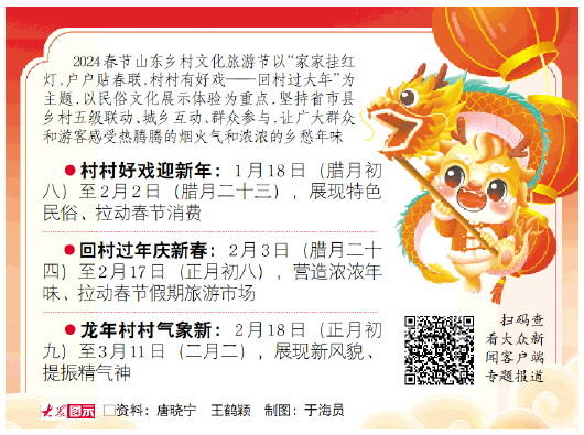“本次2024春节山东乡村文化旅游节以‘家家挂红灯,户户贴春联,村村有好戏——回村过大年’为主题,以民俗文化展示体验为重点,坚持省市县乡村五级联动、城乡互动、群众参与,让广大群众和游客感受热腾腾的烟火气和浓浓的乡愁年味。”省委宣传部副部长张同海说。