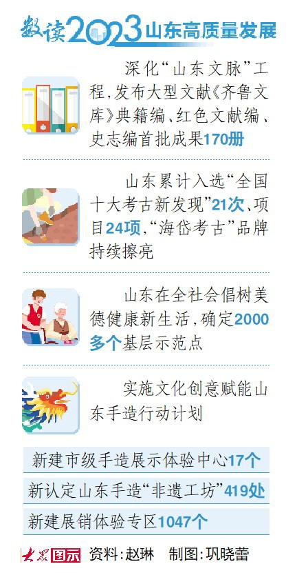 2022年,山东印发实施《关于打造中华优秀传统文化“两创”新标杆行动计划(2022-2025年)》,文化“两创”工作全面起势,聚力打造7个新标杆。其中,赓续“山东文脉”被确定为重点文化工程,计划用10年左右时间,全面研究、保护、辑录和整理出版山东历代传世文献,同步建设齐鲁文献数字化文库和新媒体传播平台。