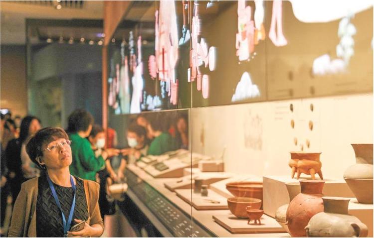 观众在参观“海岱日新—山东历史文化展”展出的史前时期陶器。(□新华社发)