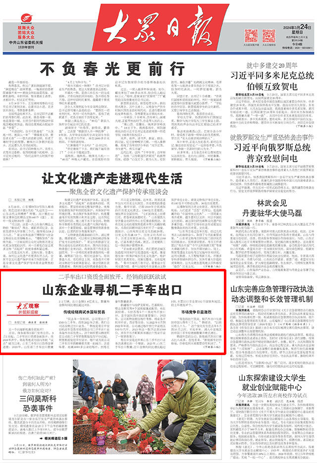 近日,商务部等5部门发布公告,3月1日起,二手车出口资质全面放开。自2019年济宁、青岛等地成为国内首批“试点”城市以来,山东二手车出口取得显著进展:2023年,山东省二手车出口数量2.2万辆,出口金额5.8亿美元,数量和金额均同比增长超过3倍。