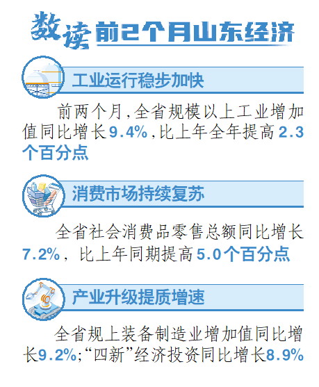 市场需求稳固恢复。前两个月,全省固定资产投资同比增长5.3%,比上年全年高0.1个百分点。其中,制造业投资增长8.0%,上拉全部投资增速2.3个百分点;基础设施投资增长5.5%,上拉全部投资增速1.1个百分点,有效投资持续扩大。