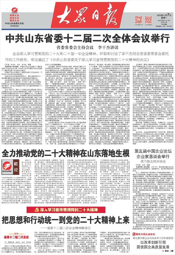 中国共产党山东省第十二届委员会第二次全体会议,于2022年11月5日至6日在济南举行。