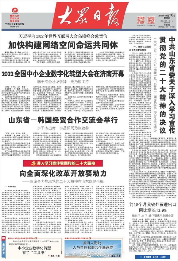 11月9日上午,由工业和信息化部、山东省政府共同主办的2022全国中小企业数字化转型大会在山东国际会展中心开幕。